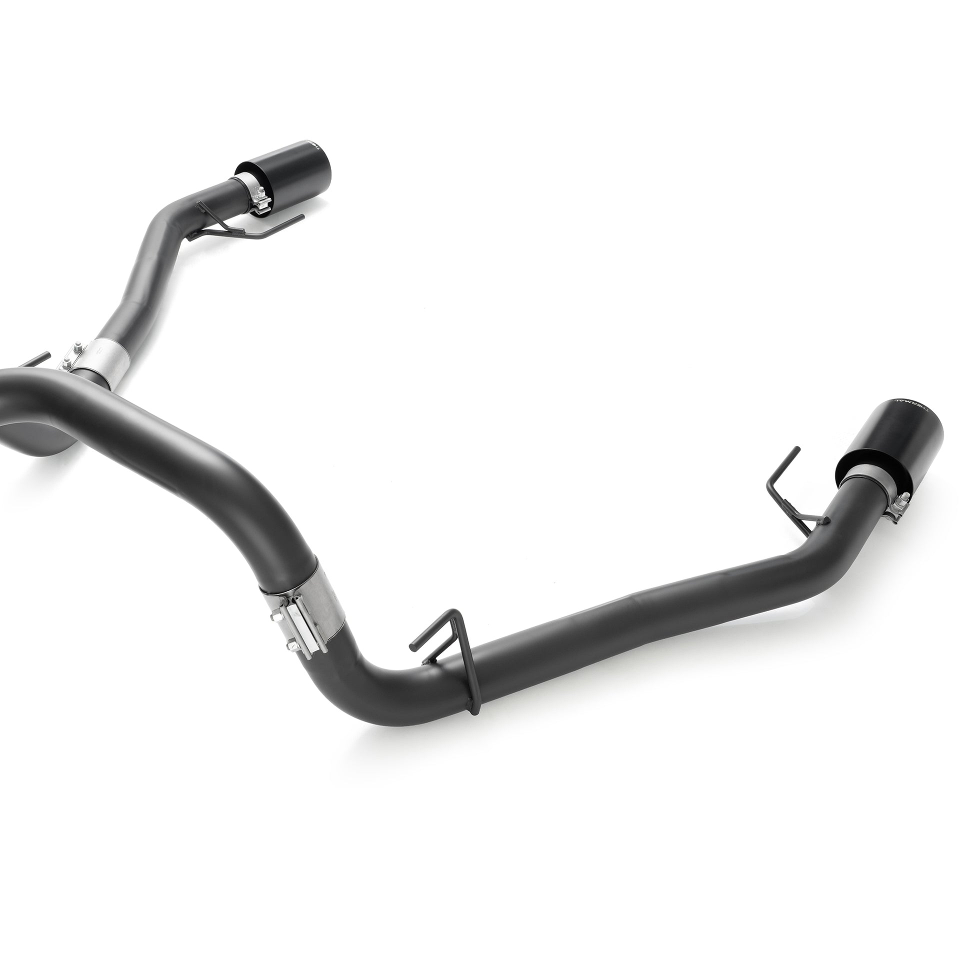 Out back, bold 5-inch tips properly fill the rear valance. They're available in 5" black coated or polished stainless steel. The rear section is also finished in black ceramic to manage heat around the spare tire while maintaining a clean, factory-style appearance.