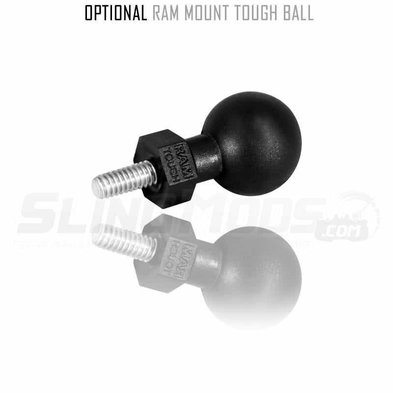 This billet adapter plate is CNC'd in the USA and is a simple bolt-on piece for a quick and easy upgrade. The backside of the bracket has integrated channels to allow for the SSV speaker wires to run seamlessly behind the bracket and out of site. The bracket is powdercoated in a satin black textured finish to compliment the Ryker body panels for a stealthy look. There's also a threaded M6 x 1.0 hole drilled into the bracket that allows for an optional RAM mount tough ball to be mounted front and center for things like your cell phone or gps device.