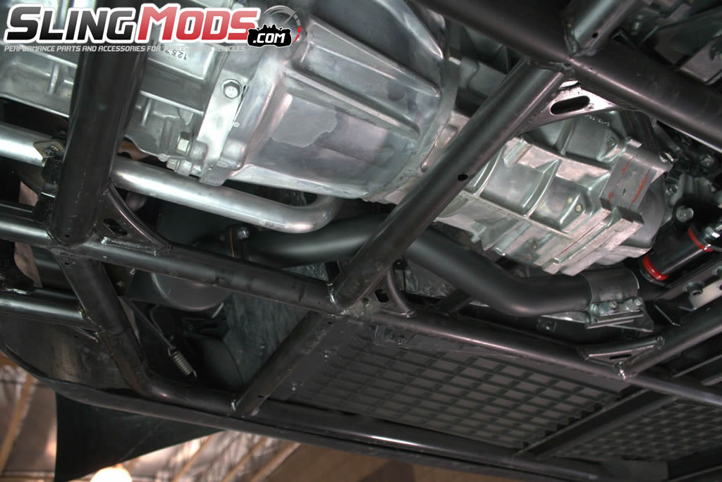 The entire system is built from 304 mandrel bent stainless steel and tucks in the trans tunnel so that you don't lose ground clearance. The exhaust system features custom billet aluminum exhaust hangars for the rear end and a trans tunnel mount with polyurethane bushings for the center support along with a center slip joint to allow for vast temperature variations.